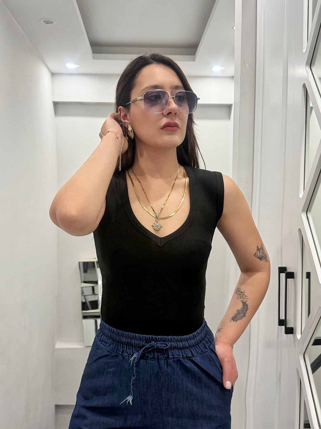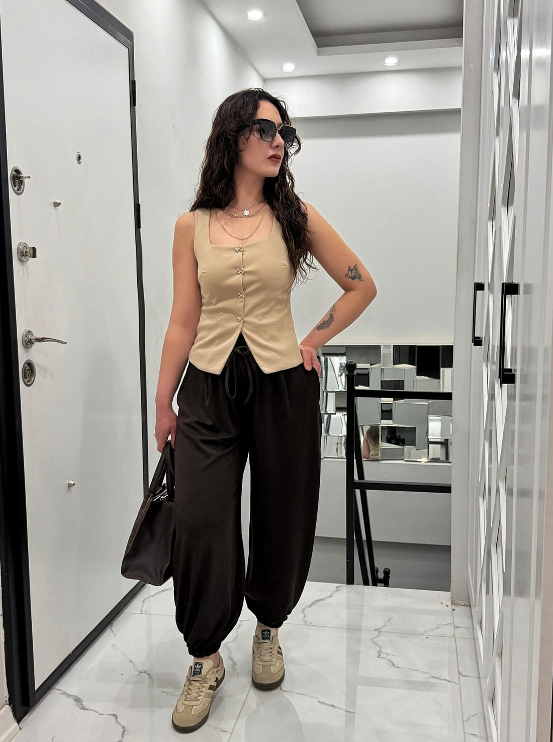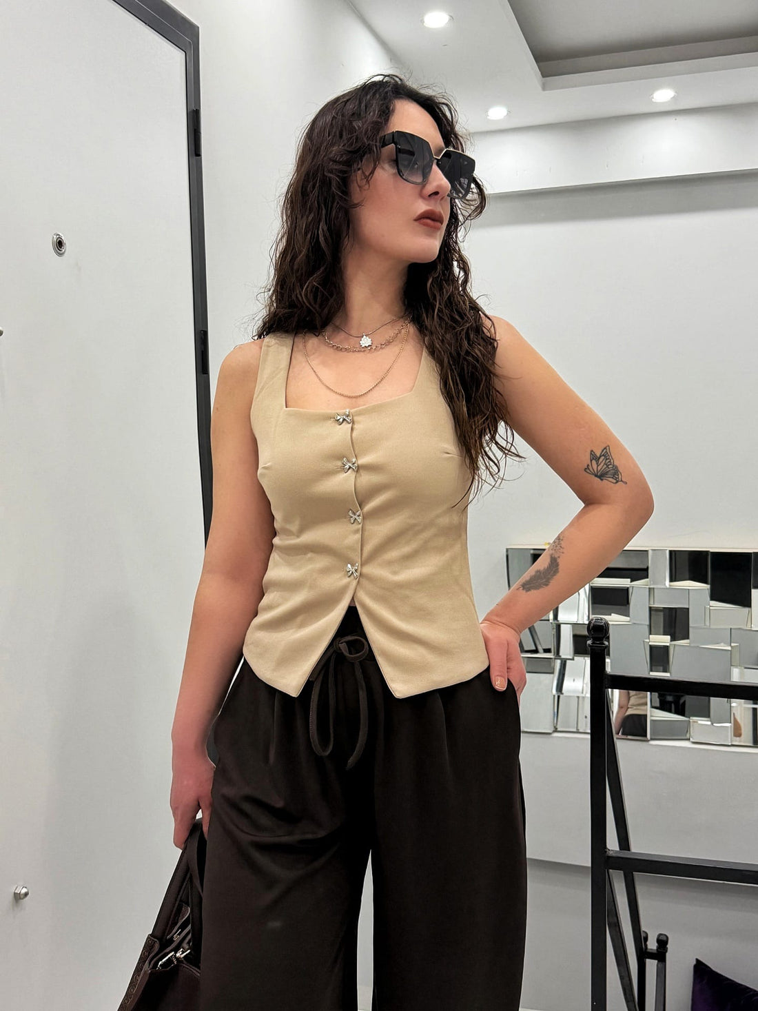 KARE YAKA DÜĞME DETAYLI LİKRALI YELEK
