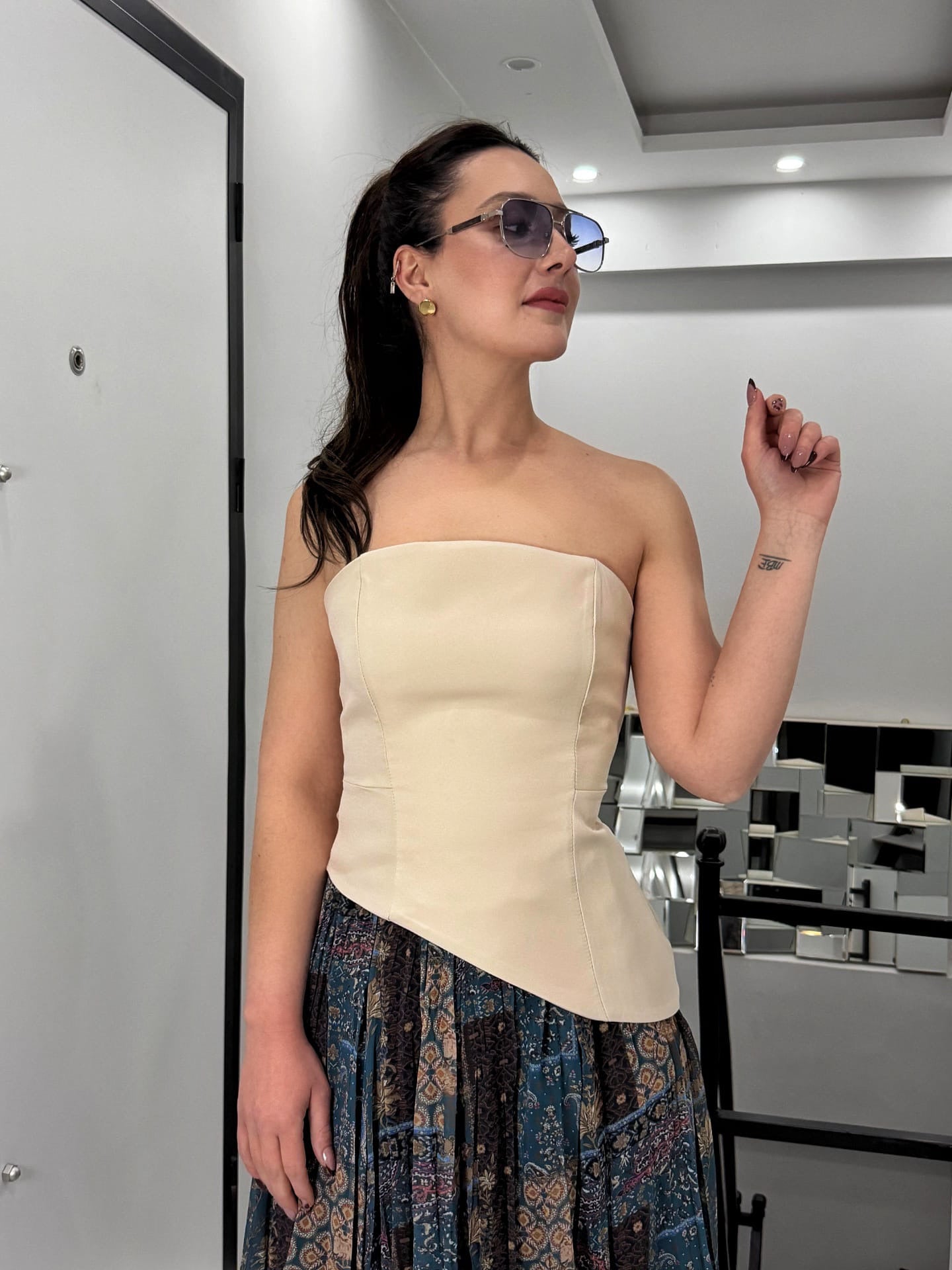 Modern ve dikkat çekici tasarımıyla öne çıkan bu asimetrik kesim straplez bluz, güçlü duruşu ve tok kumaşı sayesinde vücuda kusursuz bir form kazandırır. Şık ve minimal görünümüyle hem günlük kombinlerde hem de özel davetlerde rahatlıkla tercih edilebilir.